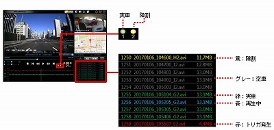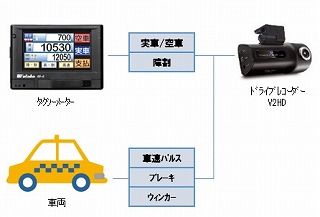 | 記録データ | 映像(前方/車内)、日時、速度(車速パルス/GPS)、加速度、位置、 ウインカー、 ブレーキ、外部入力(タクシーメーター等) |