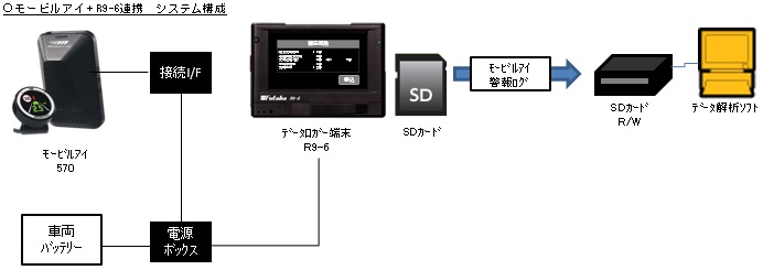 ・衝突防止警報装置モービルアイとデータロガー端末R9-6を連携し、モービルアイの警報ログデータをR9-6に挿入するSDカードに 記録、データ解析ソフトで各種集計帳票を表示・印字します。 |